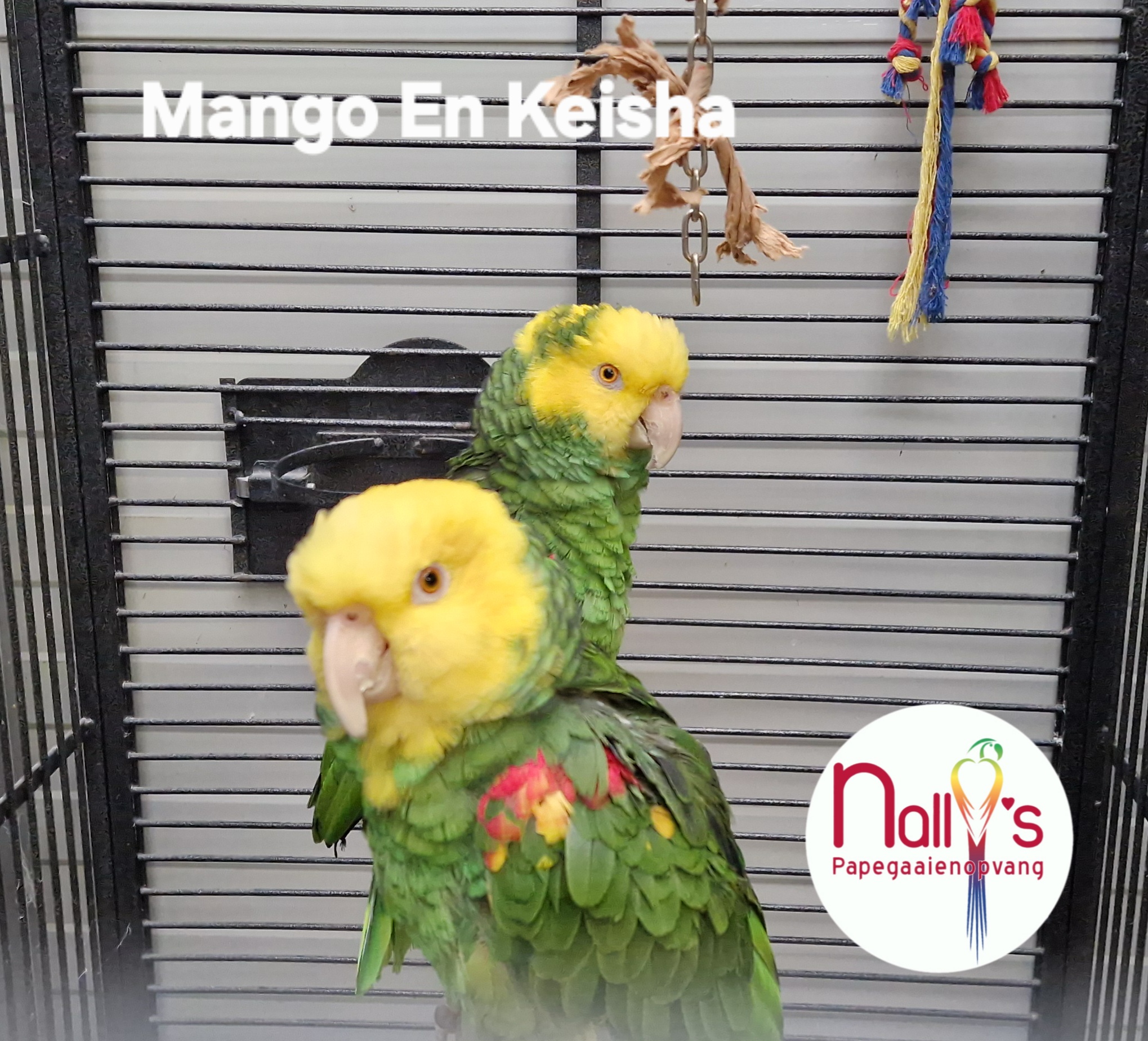 Mango en Keisha, dubbelgeelkop amazones. Zitten samen in een grote kooi in de huiskamer. Vliegen samen rond. Eten pellets groente en snackjes. Babbelen een beetje. Keisha vind douchen met de plantenspuit prima, Mango is hier bang voor. Mango is een echte knuffelaar bij vrouwen.